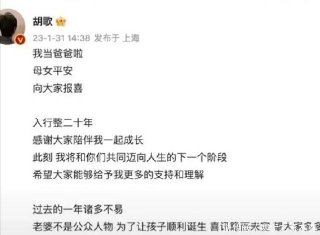 2023年1月31日,胡歌在微博官宣,说自己已经结婚当爸了,女儿出生。整个过程就是顺其自然,从工作伙伴到伴侣,没啥特别的内幕。网上有知情人说,他们认识近八年,感情是慢慢升温的,她勤快细心,胡歌看重这点。结婚不是啥逼婚或者奉子成婚的猫腻,就是两人合拍,决定一起过日子。